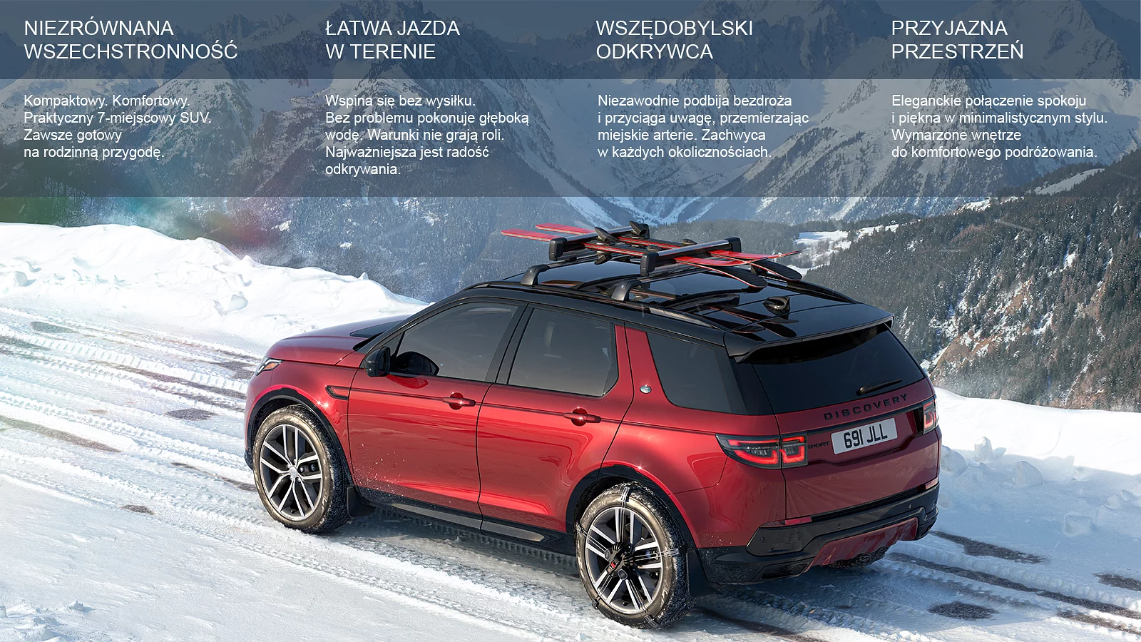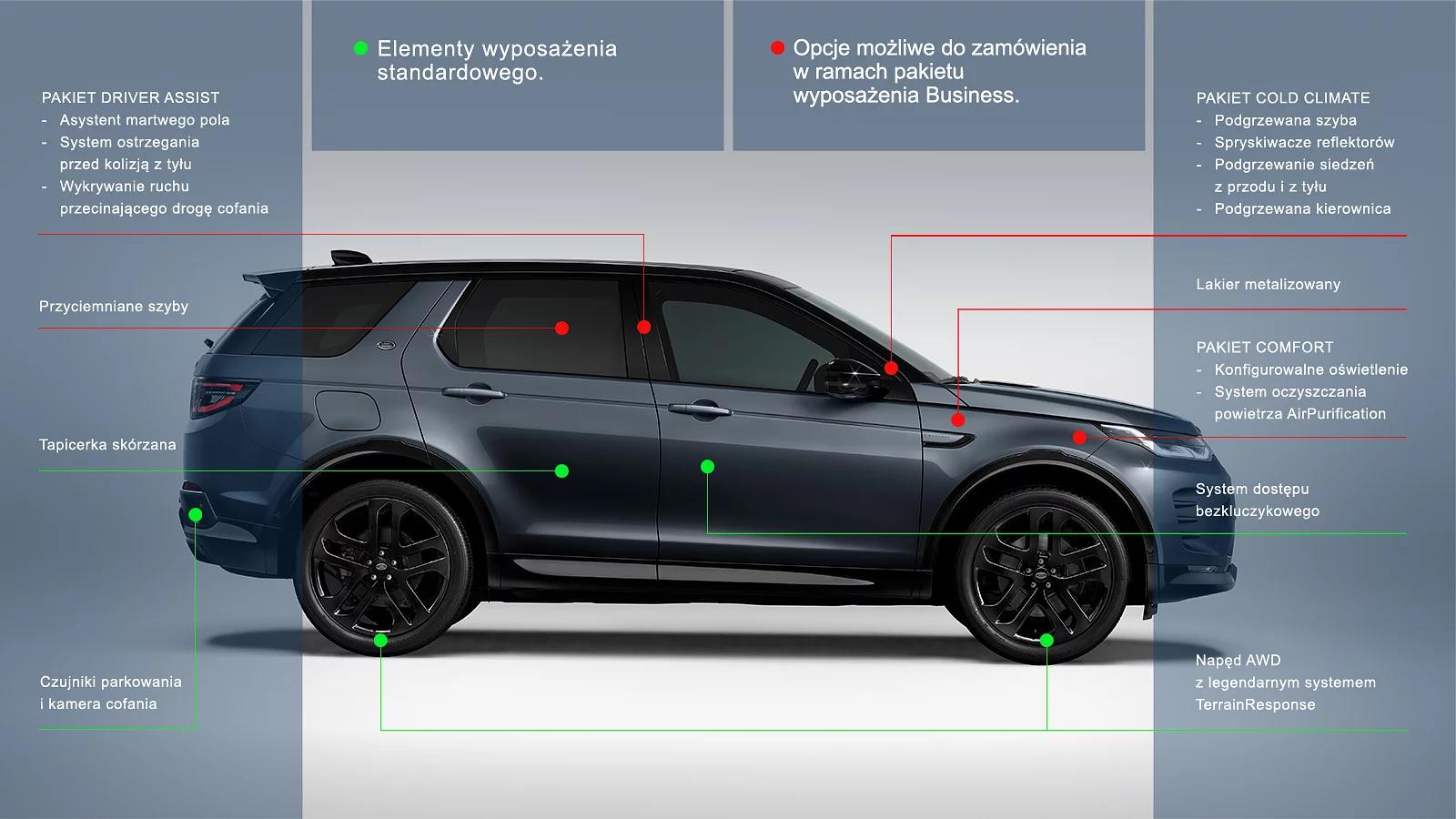Kalkulacja została sporządzona przy uwzględnieniu następujących założeń dotyczących rodzaju umowy leasingu Full Service for Business ceny pojazdu u Autoryzowanych Dealerów, okres trwania umowy- 2 lata , 15% opłaty wstępnej, roczny limit przebiegu 15.000 km. Wysokość raty miesięcznej jest stała w całym okresie obowiązywania umowy, zawiera obsługę serwisową w limicie 15 tyś. km / rok, auto zastępcze na czas naprawy mechanicznej do 10 dni. Finansowanie zostało wyliczone na podstawie oferty Prime Car Managment S.A. Zawarcie umowy i przyznanie finansowania jest uzależnione od pozytywnego wyniku weryfikacji prawnofinansowej Klienta oraz zawarcia ubezpieczenia OC/AC. Wysokość raty nie obejmuje ubezpieczenia OC/AC. Zawarcie umowy leasingowej z wykorzystaniem produktu promocyjnego wiąże się z wymogiem nabycia pakietowego ubezpieczenia komunikacyjnego oferowanego w ramach programu importerskiego przez. Dealerów JLR, dostępnego w jednym z trzech wskazanych towarzystw ubezpieczeniowych (PZU S.A., Ergo Hestia S.A. lub Generali S.A.), o ile spełnione zostaną przez Klienta warunki wariantu promocyjnego. Powyższa kalkulacja promocyjnej oferty finansowania i ubezpieczenia dotyczy samochodów Discovery Sport 2.0D TD4 204 PS AWD AUTO Metropolitan MY26, zamówionych w okresie od 28 listopada 2025 r. do 31 grudnia 2025 roku. Najniższa rata miesięczna wynajmu długoterminowego dla powyższej konfiguracji w okresie 30 dni wynosiła 1800 PLN netto. Wiążąca dla możliwości skorzystania z kalkulacji oferty jest data podpisania umowy sprzedaży (zamówienia) samochodu objętego w/w kalkulacją promocyjnej oferty. Informacje zaprezentowane w niniejszym materiale nie stanowi oferty, zapewnienia ani oświadczenia gwarancyjnego w rozumieniu przepisów Kodeksu Cywilnego. W celu uzyskania informacji na temat szczegółów finansowania prosimy o kontakt z wybranym dealerem Jaguar Land Rover. Kalkulacja promocyjnej oferty jest skierowana wyłącznie do przedsiębiorców. Ceny mogą różnić się u poszczególnych dealerów.