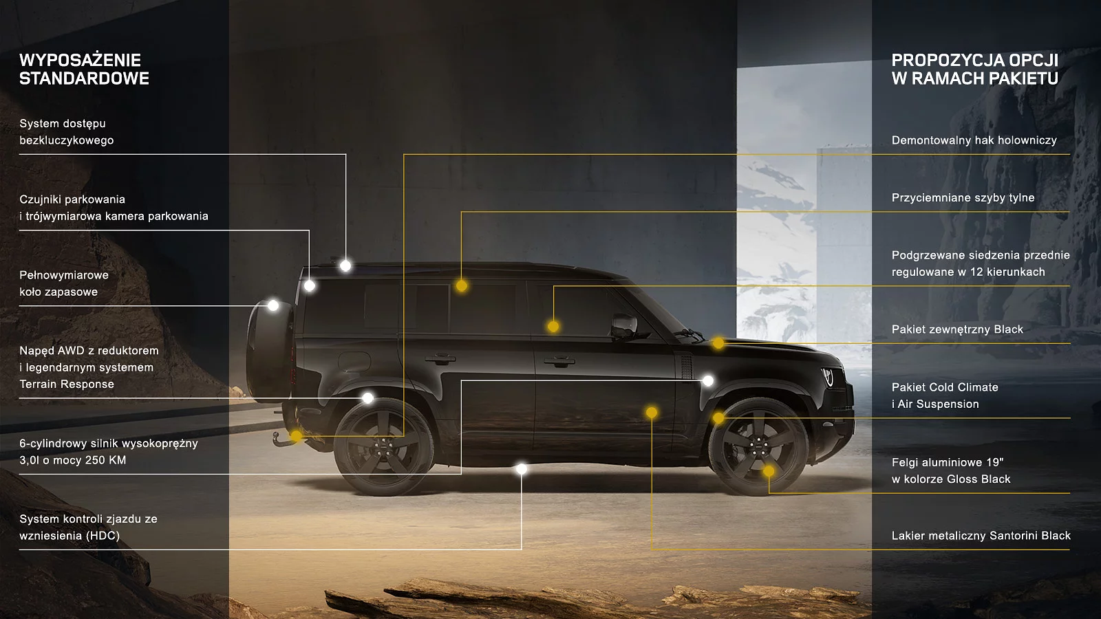 Kalkulacja została sporządzona w oparciu o Produkt „Leasing To Go” na podstawie stałej stopy IRS 36 m-cy = 3,7057%, aktualizowanej w cyklach dziennych, powiększoną o marżę oraz przy wybranych założeniach dotyczących rodzaju umowy (leasingu: Leasing To Go) ceny pojazdu, okres trwania umowy 36 miesięcy, 15% opłaty wstępnej, roczny limit przebiegu 15 tys. km. Finansowanie zostało wyliczone na podstawie oferty PKO Leasing S.A. Zawarcie umowy i przyznanie finansowania uzależnione jest od pozytywnego wyniku weryfikacji prawno-finansowej Klienta oraz zawarcia ubezpieczenia OC/AC. Wysokość raty nie obejmuje ubezpieczenia OC/AC. Wysokość opłat za korzystanie z wybranego produktu finansowego jest określona w PLN. Zawarcie umowy leasingowej z wykorzystaniem produktu promocyjnego wiąże się z wymogiem nabycia pakietowego ubezpieczenia komunikacyjnego oferowanego w ramach programu importerskiego przez Dealerów JLR, dostępnego w jednym z trzech wskazanych towarzystw ubezpieczeniowych (PZU S.A., Ergo Hestia S.A. lub Generali S.A.), o ile spełnione zostaną przez Klienta warunki wariantu promocyjnego. Powyższa kalkulacja promocyjnej oferty finansowania i ubezpieczenia dotyczy samochodów DEFENDER 110 3.0 D250 MY26, zamówionych w okresie od 26 stycznia 2026 r. do 31 marca 2026 r. i jest ważna do wyczerpania zapasów oraz dotyczy tylko samochodów znajdujących się na składach dealerów JLR w Polsce. Najniższa rata miesięczna „Leasingu to Go” dla powyższej konfiguracji w okresie 30 dni wynosiła 3290 PLN netto. Wiążąca dla możliwości skorzystania z kalkulacji oferty jest data podpisania umowy sprzedaży (zamówienia) samochodu objętego ww. kalkulacją promocyjnej oferty. Informacje zaprezentowane w niniejszym materiale nie stanowią oferty, zapewnienia ani oświadczenia gwarancyjnego w rozumieniu przepisów Kodeksu Cywilnego. W celu uzyskania informacji na temat szczegółów finansowania prosimy o kontakt z wybranym dealerem Jaguar Land Rover. Kalkulacja promocyjnej oferty jest skierowana wyłącznie do przedsiębiorców. Ceny mogą różnić się u poszczególnych dealerów.